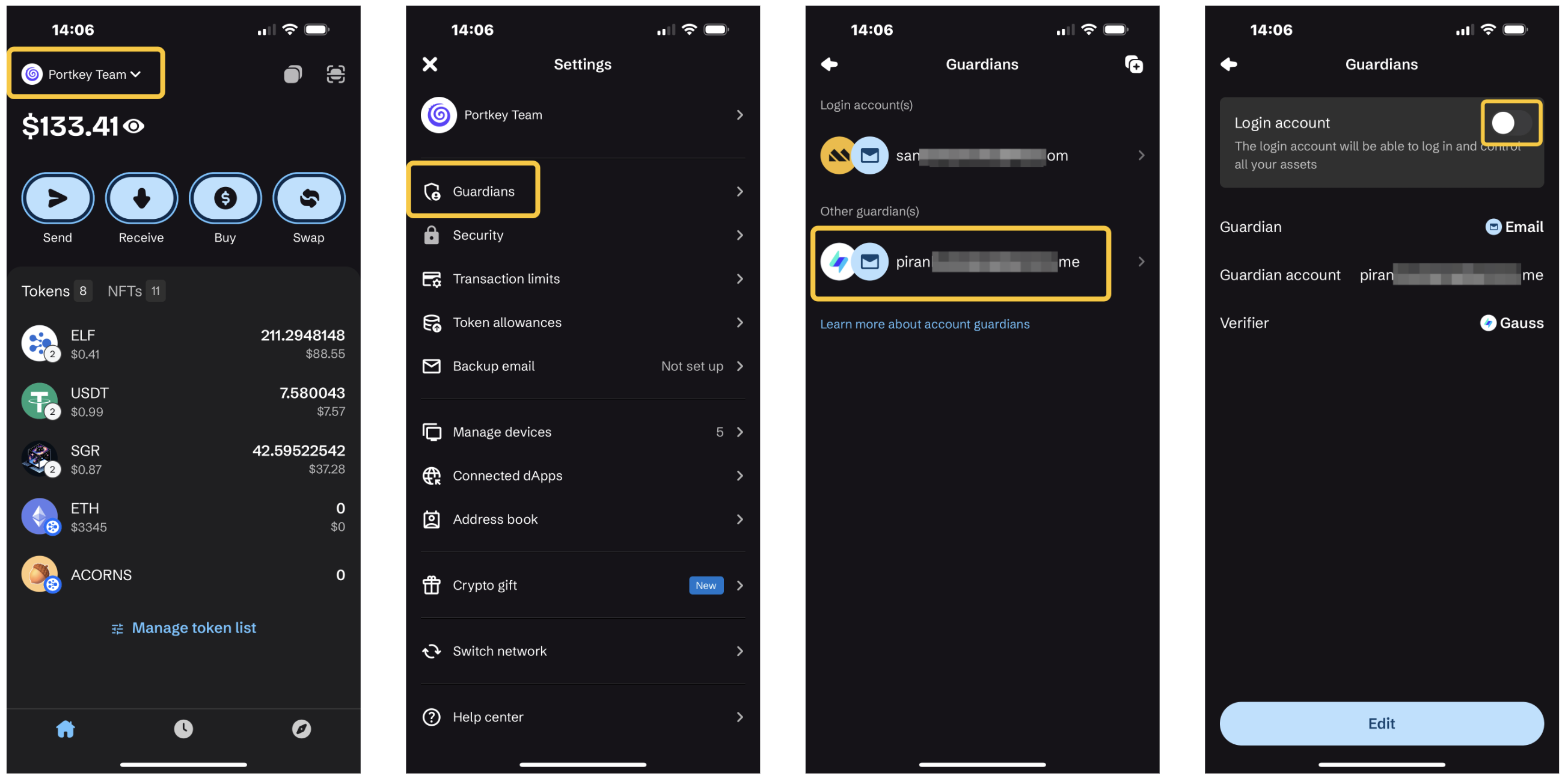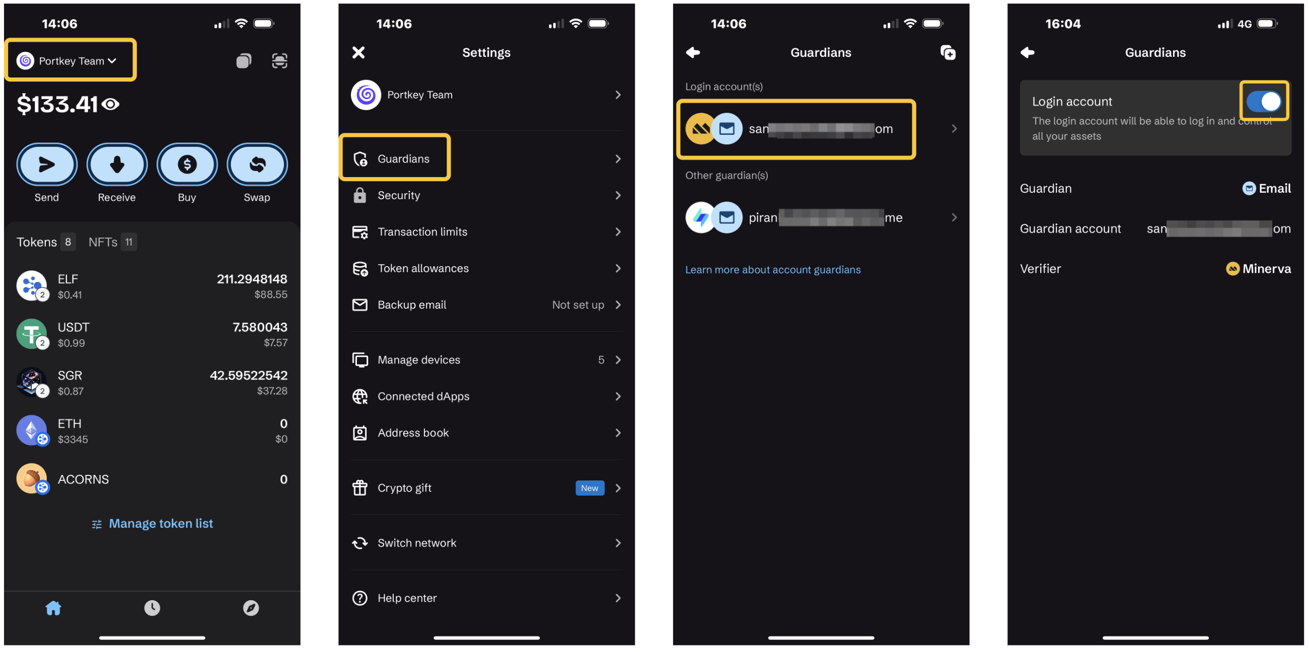 - On the Portkey home screen, click your account name, then select "Guardians" from the dropdown list. Here, you'll see your current guardians.